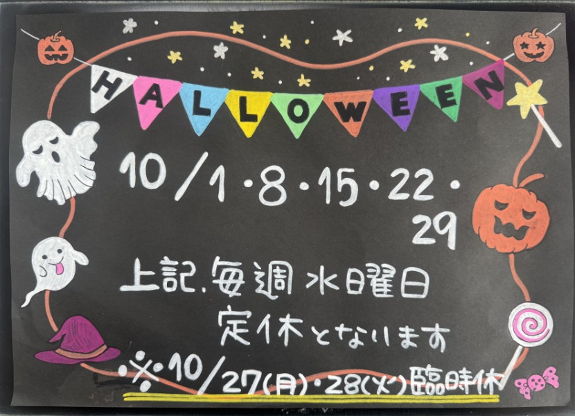 【10月お休み情報】 いつもありがとうございます☺ ※10月臨時休業あります! 皆さま、こんにちは☀ 夏の暑さもようやく過ぎ去り、すっかり秋🍁を感じられるようになりました。 いかがお過しでしょうか? 10月店休日のご案内です。 見づらくて申し訳ございません・・・ ※10月27日(月)~29日(水)臨時休業となります。 大変ご迷惑をおかけしますが、どうぞ宜しくお願い申し上げます。